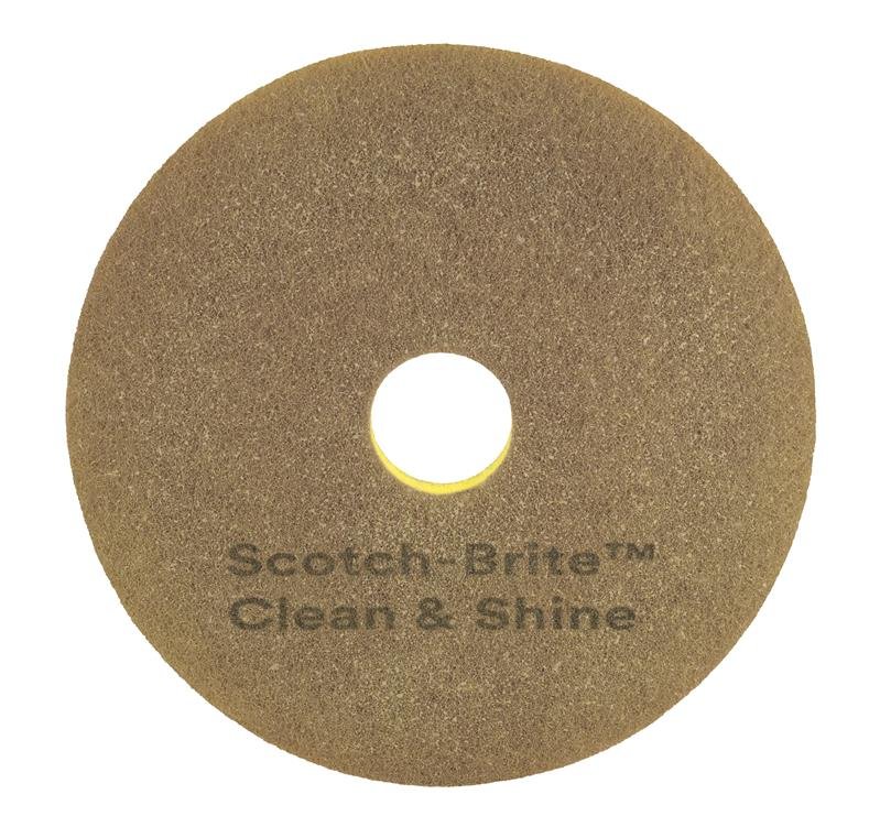 O Disco Clean & Shine Scotch-Brite ™é composto por fibras de poliéster, limpando e dando brilho em uma mesma etapa, ao ser utilizado por apenas uma máquina de baixa velocidade. Os discos circulares estão disponíveis em vários tamanhos e possuem a espessura de 2,54 cm em média. Eles também possuem um sistema de contraste da cor entre o interior do disco e o revestimento, para indicar desgaste.